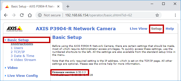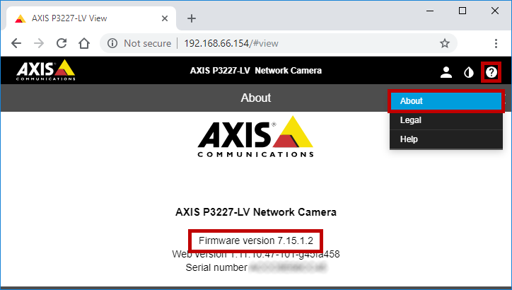 You may find the firmware version of your Axis camera on its web interface, either in the Setup→Basic Setup page (v6.x.x and below) or the Help→About page (v7.x.x. and above).