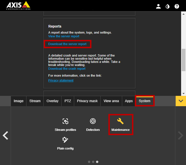 Follow the instructions below to navigate to the log(s) and server report. How you get to them depends on your camera’s firmware version range.