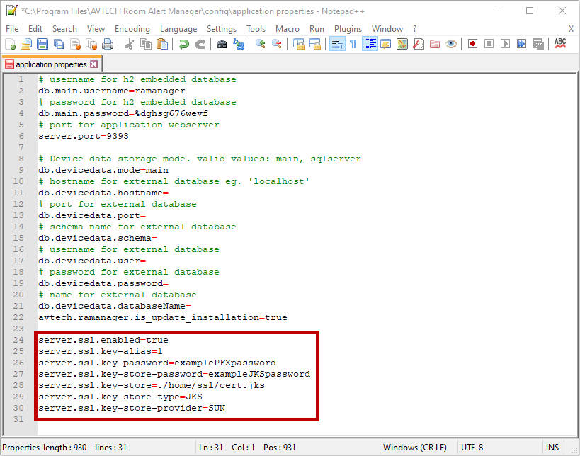 For a more secure web interface, you can configure Room Alert Manager to use an SSL certificate. This will allow the software’s web interface to use HTTPS, as shown in the screenshot below: