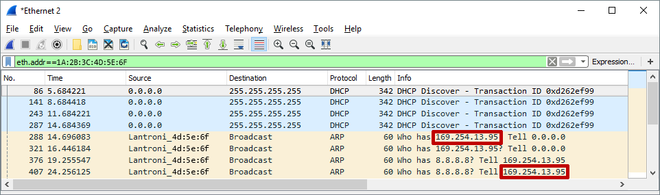 – This screenshot from Wireshark shows the Room Alert (on DHCP) first booting up while it is connected directly to a computer. You can see its random 169.254.xxx.xxx IP address in the Info column.
