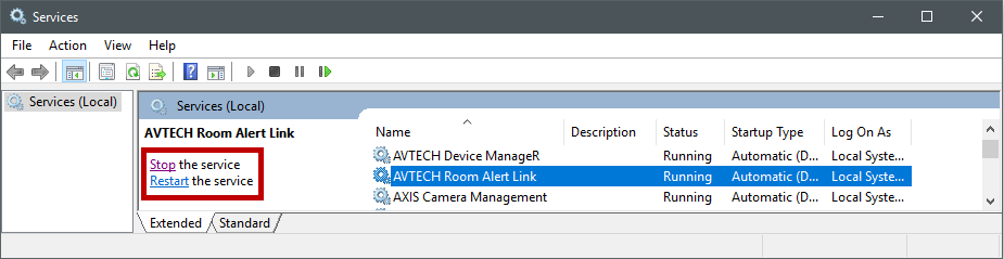 Room Alert Link runs as a local service on the Windows system it is installed on. By default, it’s configured to start automatically when the Windows system starts. To perform certain tasks, you may need to stop, start or restart the service.