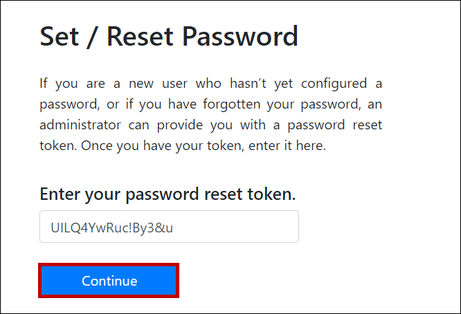 3. In the Set / Reset Password page, enter your token and select Continue.
