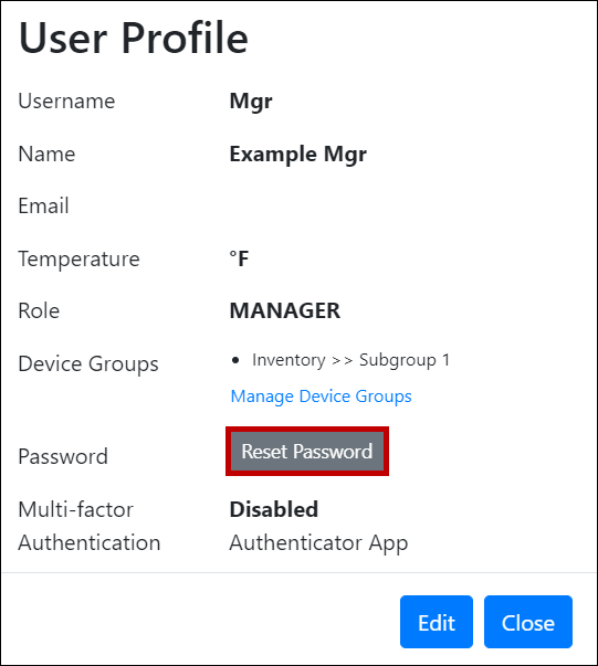 Only admin-level users can reset user passwords in Room Alert Manager. If you have lost / forgotten your password, please ask an administrator for a reset token.