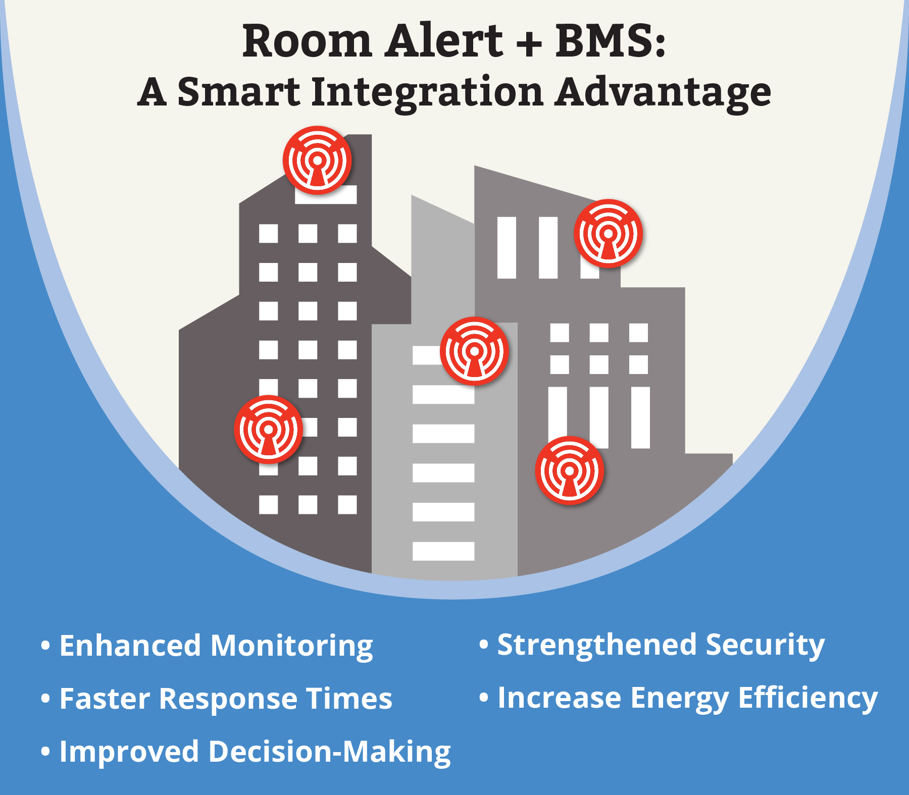 The future of smart buildings lies in integrating advanced technologies like BMS and Room Alert. Together, these tools create a powerful, adaptable solution that enhances efficiency, reliability, security and sustainability, meeting the evolving demands of modern facility management.