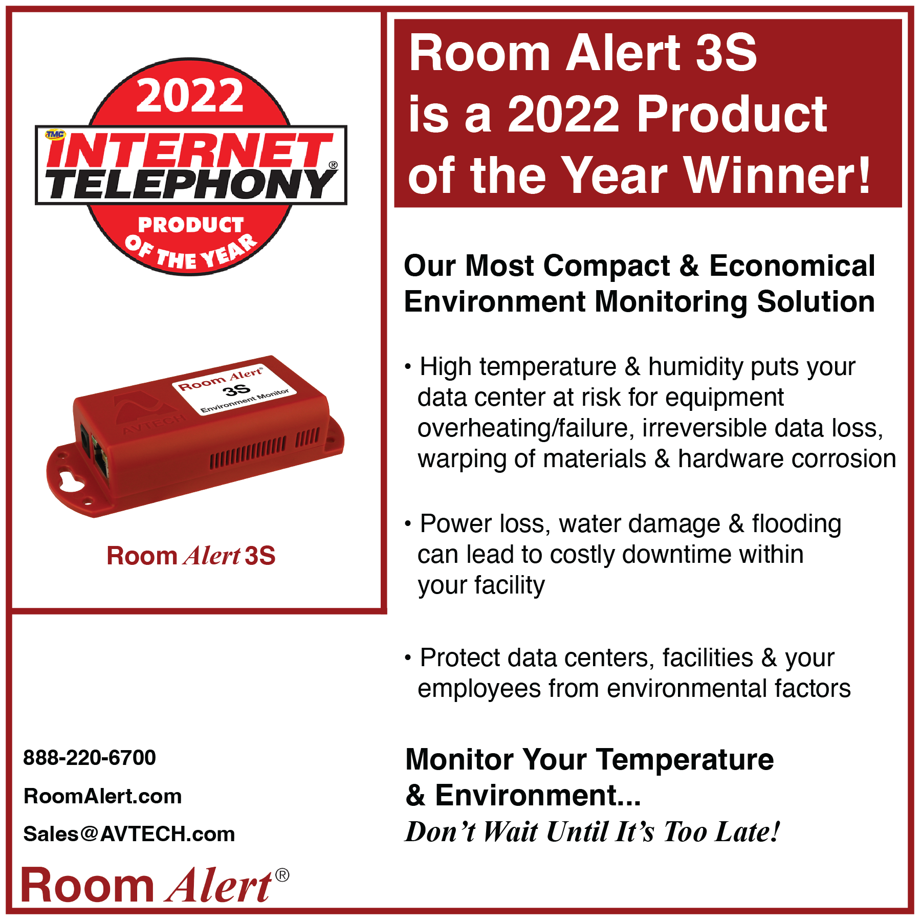 We’re honored to announce that the Room Alert 3S has received a 2022 INTERNET TELEPHONY Product of the Year Award! Though we have received several awards recently, we are especially proud of this achievement because it is the second consecutive year that Room Alert environment monitoring has been recognized as a “Product of the Year”. Right around this time last year, our advanced and secure Room Alert PRO Line received the 2021 INTERNET TELEPHONY Product of the Year award. At the time of the “Product of the Year” awards in 2021, we had not yet launched our Room Alert 3S. Our Room Alert 3S has been massively successful and we attribute that success to the incredible engineering that went into developing this powerhouse product.