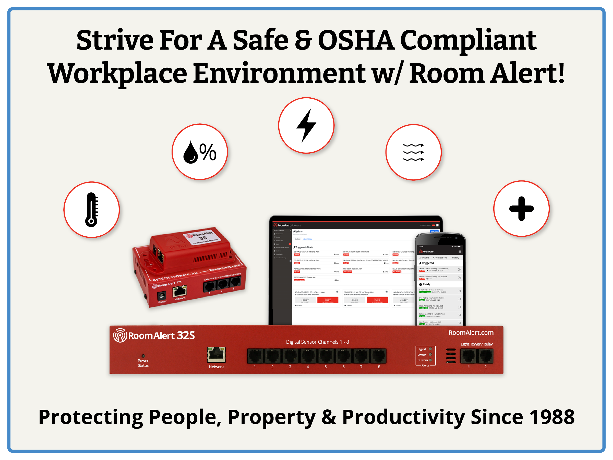If you have any questions or want additional information on how Room Alert can help ensure your OSHA compliance, please contact us today through email at Sales@RoomAlert.com, through our online Live Chat service, or via phone at 401.628.1600. For additional information, check out more of our articles on Safety & Compliance.
