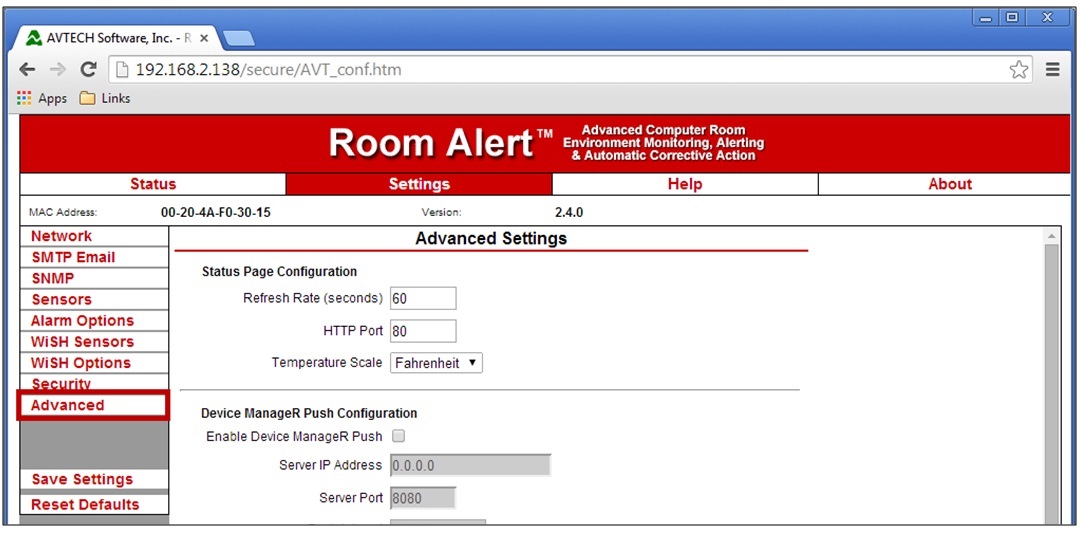 1. Open your Room Alert Monitor’s web interface. You may open the interface with Device Discovery or Device ManageR or by entering the IP address of the unit directly into the address bar of your web browser.