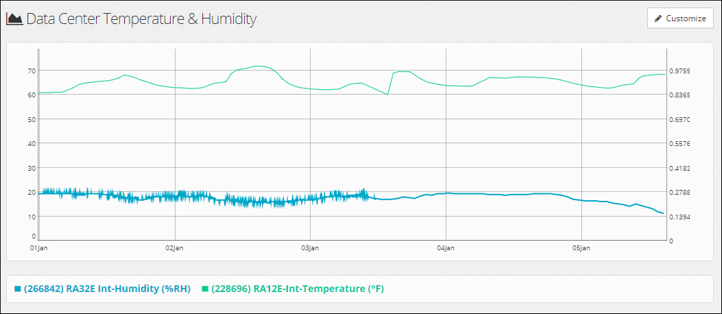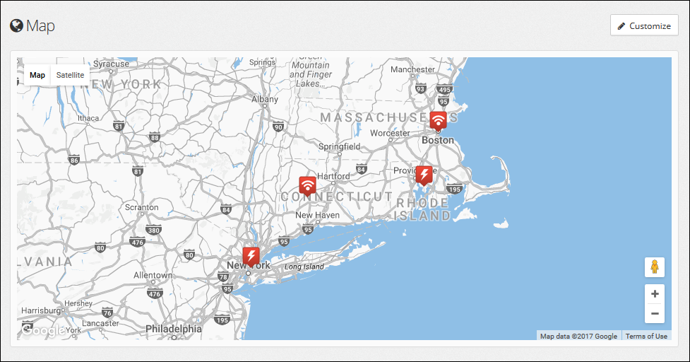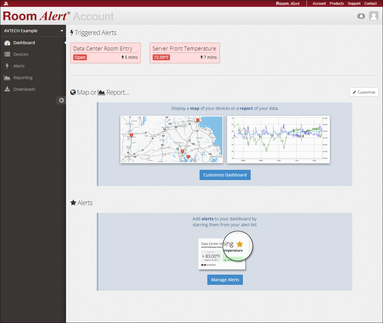 You may configure the dashboard* in your Room Alert Account to display a map of your devices or a report of sensor data, plus any alerts you’ve bookmarked.