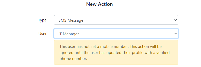 - In the New Action interface, first choose SMS Message from the Type drop-down menu.