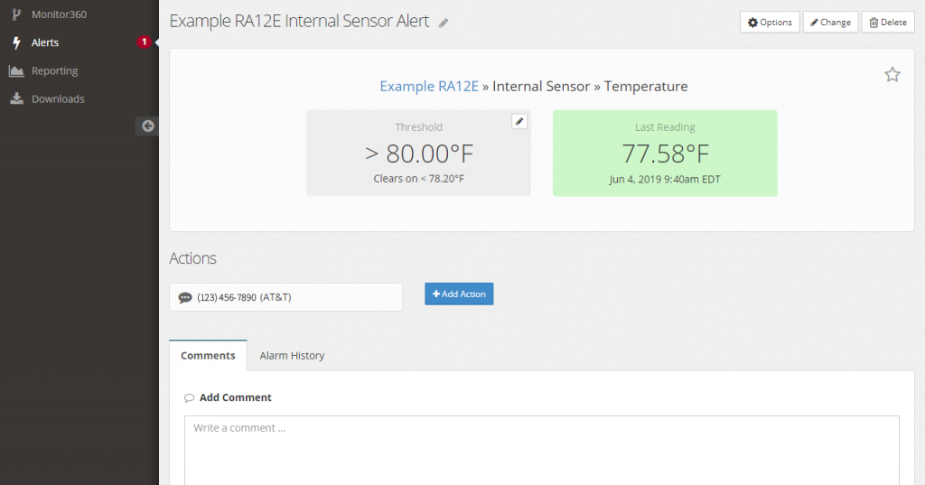 Users can comment on any of their configured alerts in their Room Alert Account, at any time from any internet-accessible device. Commenting on alerts also offers consistent and reliable trails of documented details regarding the Room Alert sensor or the environment it’s monitoring to further strengthen your business continuity plans for future unexpected circumstances. Each time a new comment is added, all of the alert’s configured actions and recipients are promptly notified.