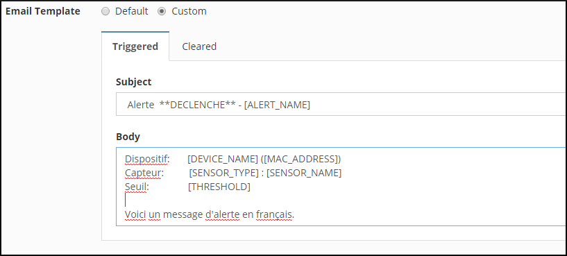 Customizing an alert is as easy as going to the Alert Options in the Room Alert Account dashboard, clicking the Custom radio button as shown below, and entering any new text you’d like for both Triggered Alerts as well as Cleared Alerts.