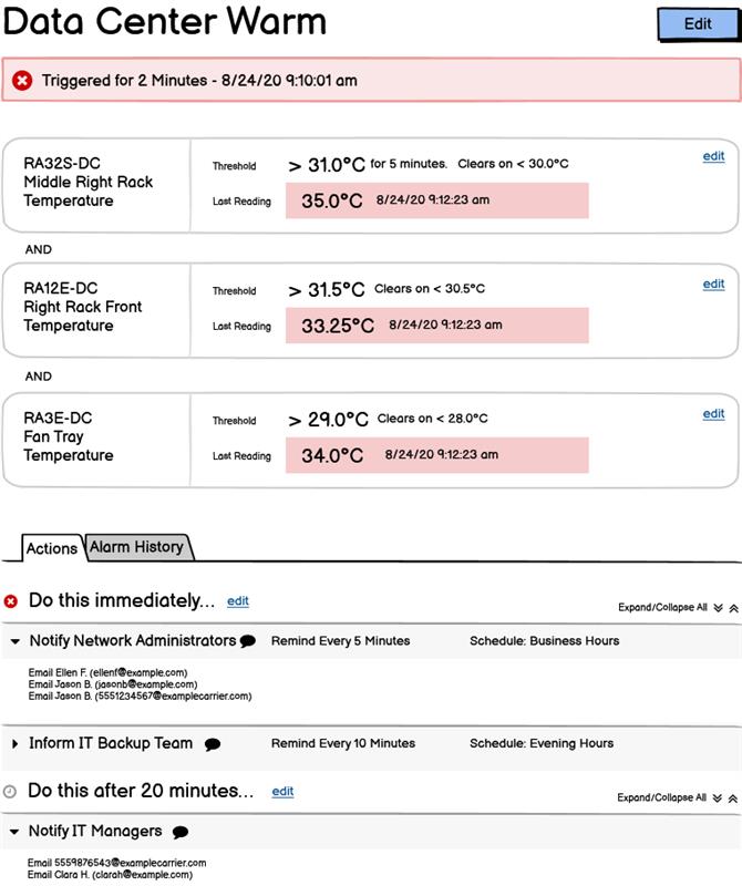 Now a combination of all 3 of those thresholds need to occur in order for your alert to reach an alarm state. You’re telling Room Alert to notify you if the temperature in your data center gets too high and the HVAC vent is not turning on to try to cool it down and the air in the data center is also being affected by the air outside the room because the door is open. If all 3 of those thresholds are met, you will receive an email that your data center alert has reached an alarm state. Now are notified that someone on your team needs to address the situation before costly downtime and disaster strike.