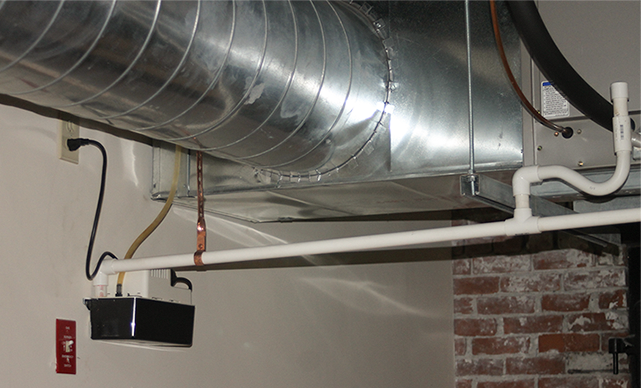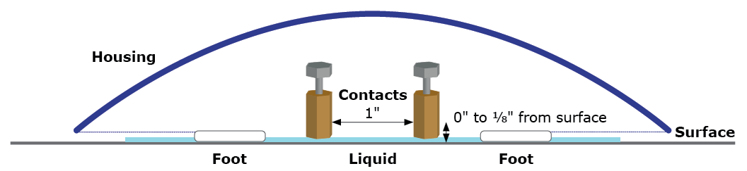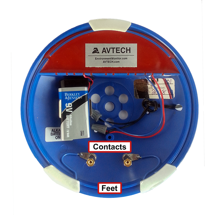 The Flood Sensor – Spot is best used in small area where water predictably collects, typically in a low spot or other known problem areas (like under an HVAC condensate pump). When liquid collects underneath the blue housing, it bridges the 2 adjustable-height contacts and trips the sensor.