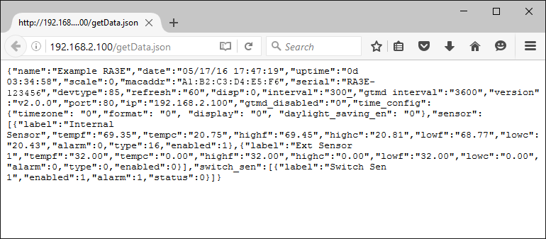 You’ll see a text file appear in your browser like the one shown below with current JSON data from your Room Alert Monitor: