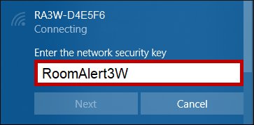 – Enter the following network security key, which is case-sensitive: RoomAlert3W.