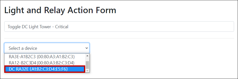 In order to toggle a Light Tower or Relay action on your Room Alert ‘S’ model, Room Alert Manager needs the device credentials. Please see our FAQ, How To Save Device Credentials In Room Alert Manager.