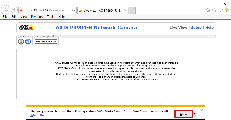 When you open your camera’s web interface in IE, you may get this message: ‘This webpage wants to run the following ad on: “AXIS Media Control” from “Axis Communications AB”.’ Select Allow to allow the installation.