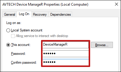 3. Enter the same credentials into the Device ManageR service to run it as an administrator. This FAQ shows you how: How To Run AVTECH’s Device ManageR As An Administrator In Windows.