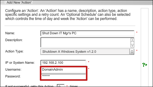 – Enter the username and password for a domain admin into the Windows action you create in Device ManageR. See this FAQ for instructions on creating Windows actions: How To Configure A Windows Plugin Bundle Action In Device ManageR.