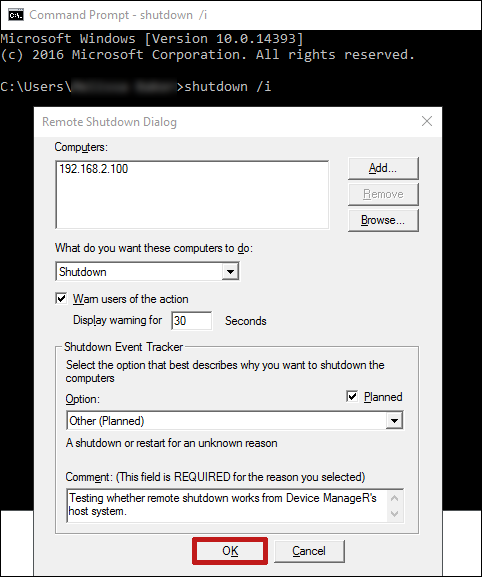 – Note, however, that the default reason for Shutdown—Other (Planned)—requires you to fill in the Comment field. We’ve entered ‘Testing whether remote shutdown works from Device ManageR’s host system.’