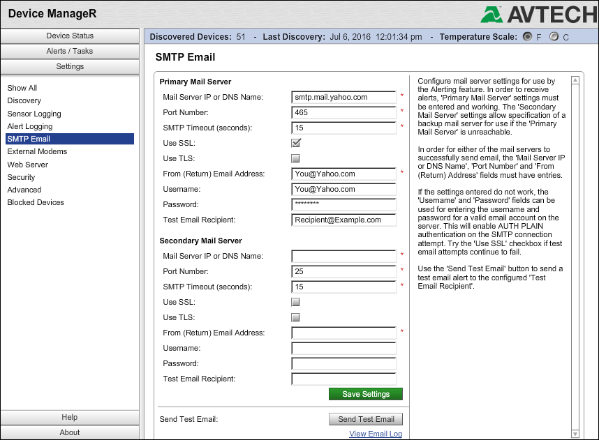 To configure Yahoo as a mail server in Device ManageR, please enter the following settings in Settings→SMTP Email.