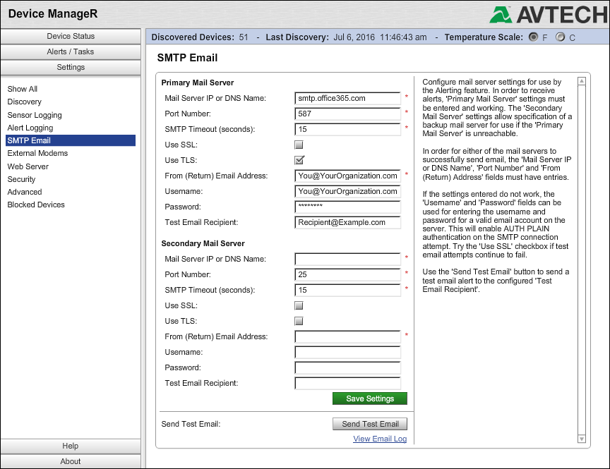 To configure Office 365 as a mail server in Device ManageR, please enter the following settings in Settings→SMTP Email.
