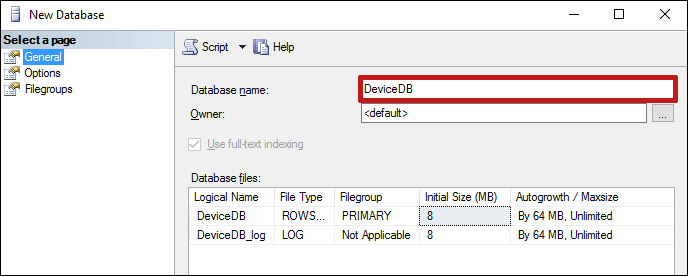 c. In Database Name, enter the name you gave your SQL Server database. In our example, our database name is “DeviceDB.”