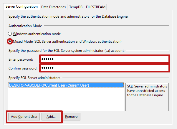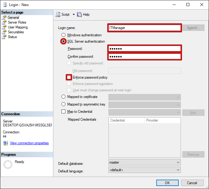 e. In Database Username, enter the username you created for your SQL Server. In our example, our username is “ITManager.”