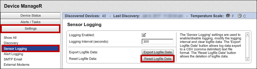 – The time is takes for the system to reset the specified data depends on the current size of your database. Please note that you will not be able to access sensor data while the data reset in in progress. Please do not stop the Device ManageR service while the reset is in progress.