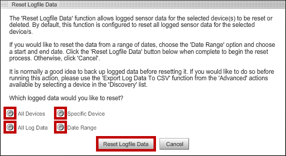 6. Once you have made your choices, select Reset Logfile Data to initiate the delete.