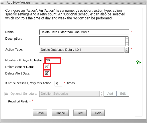 – In the Number Of Days To Retain field, enter the number of days of data you want to keep. Every time this Action is executed, it will delete any data that is older than that number. We’ll use ’30’ for this example to keep about a month’s worth of data at all times.