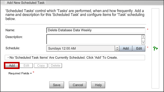 3. In the Add New Scheduled Task window, name your task. For this example, we used ‘Delete Database Data Weekly.’