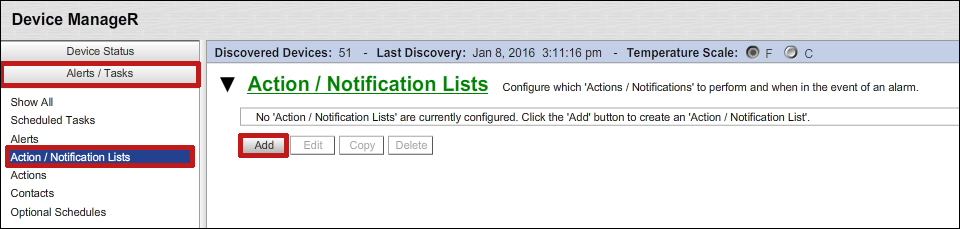 Your Action / Notification Lists may include one or many actions. Grouping actions together in an Action / Notification List allows you to execute multiple actions in response to one alert condition. In this example, we’ll group the email actions we created in the previous FAQ, How To Configure An Action In Device ManageR, in order to notify multiple contacts when an alert occurs.