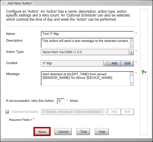 5. In the Add New Action window, enter a name for the action in Name. In our example, we’ve called the action ‘Send GSM text to IT Mgr.’