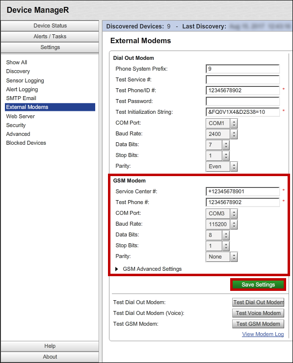 6. Then select Test GSM Modem to send a test message to the number you entered in Test Phone #.