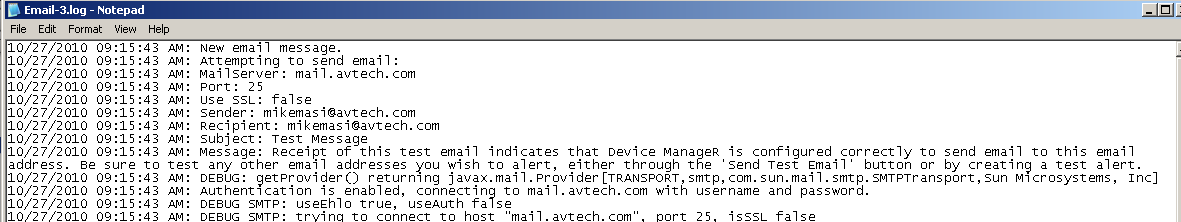 If you need to do any troubleshooting for email in Device ManageR, you may find the email log helpful. The email log shows the history of communication between Device ManageR and your mail server, including the contents of the emails themselves.