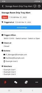 Real-time alert conversations work more like a real-time chat interface, where Room Alert users can talk to their team members in real-time, directly within the alert in the app. This allows customers to troubleshoot and coordinate a response to alert events more efficiently than ever before. For example, let’s say you receive a push notification that informs you that your HVAC unit unexpectedly lost power. You can open the Room Alert mobile app and interact with other users to determine the details of addressing the situation. Once corrective action is taken, you can promptly acknowledge the alert and clear it within your Room Alert Account so that others are able to see that the problem was resolved.