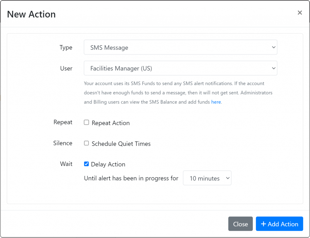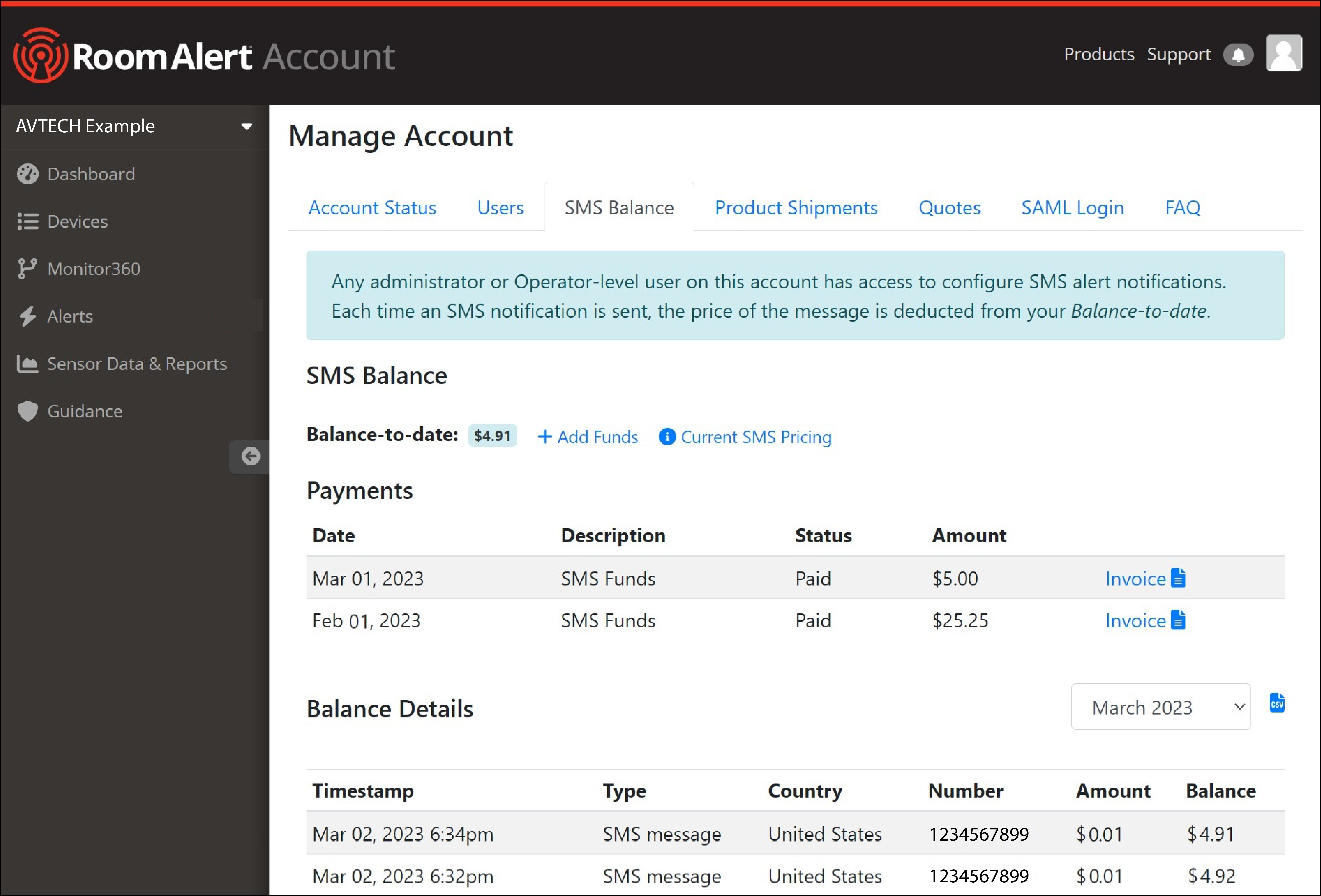 To get started utilizing native SMS alert notifications in Room Alert Account, customers must pay for SMS per message. Under the “Manage Account” tab in your Room Alert Account, users can find the new “SMS Balance” tab. Depending on what user role you are, this will affect your view and what you have access to. For example, administrators can purchase “message credits” to add funds to the account. There is no limit to how many funds you can add. You can also check the rates for native SMS messaging in your specific country.