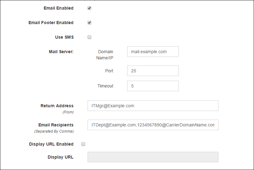 Room Alert ‘E’ models and the Room Alert 3 Wi-Fi do not support SSL or TLS mail servers. If your mail server requires SSL or TLS, you may instead use your Room Alert Account for email alerts, which does not require any mail server setup at all.