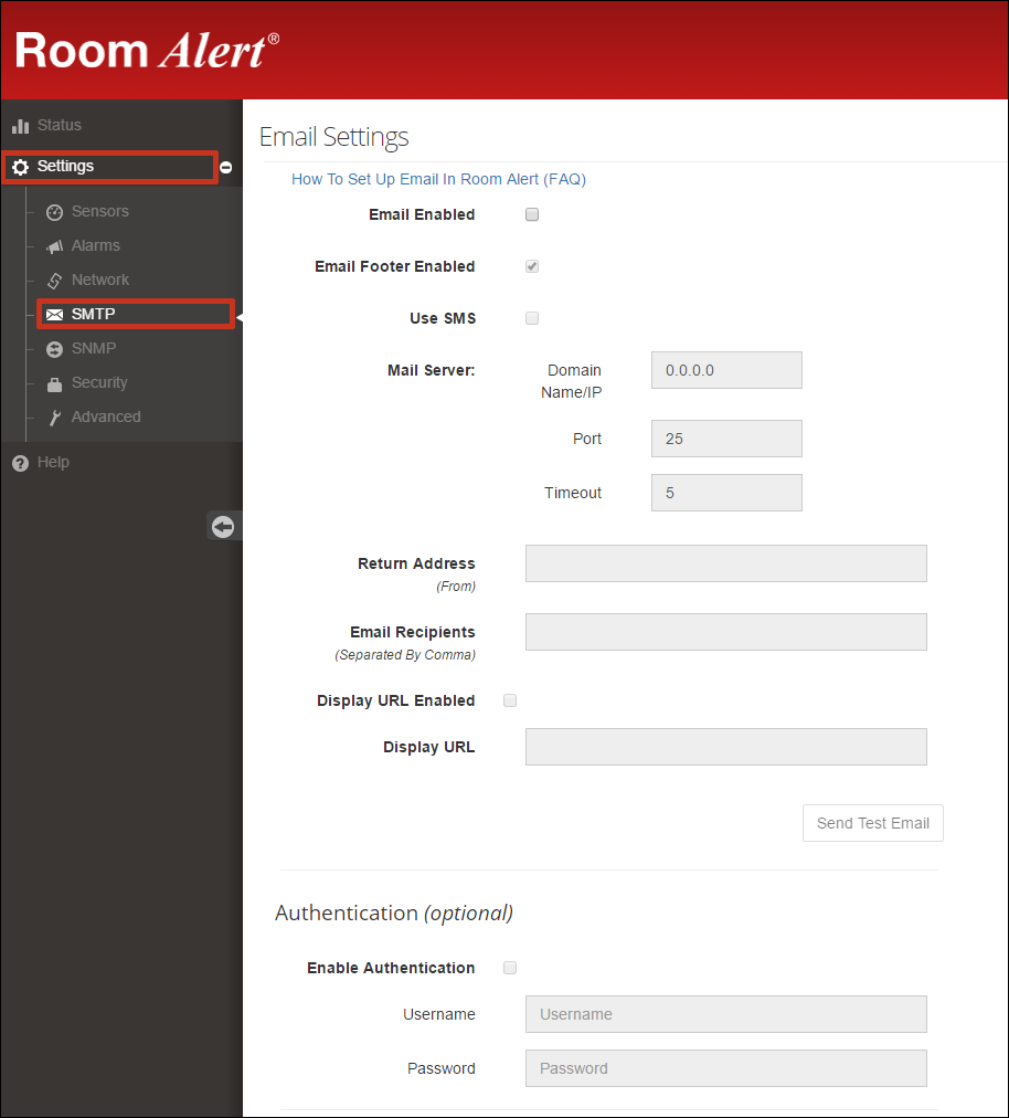 In order to send alerts based on the thresholds you configure in the Room Alert Monitor web interface, you must set up SMTP email.