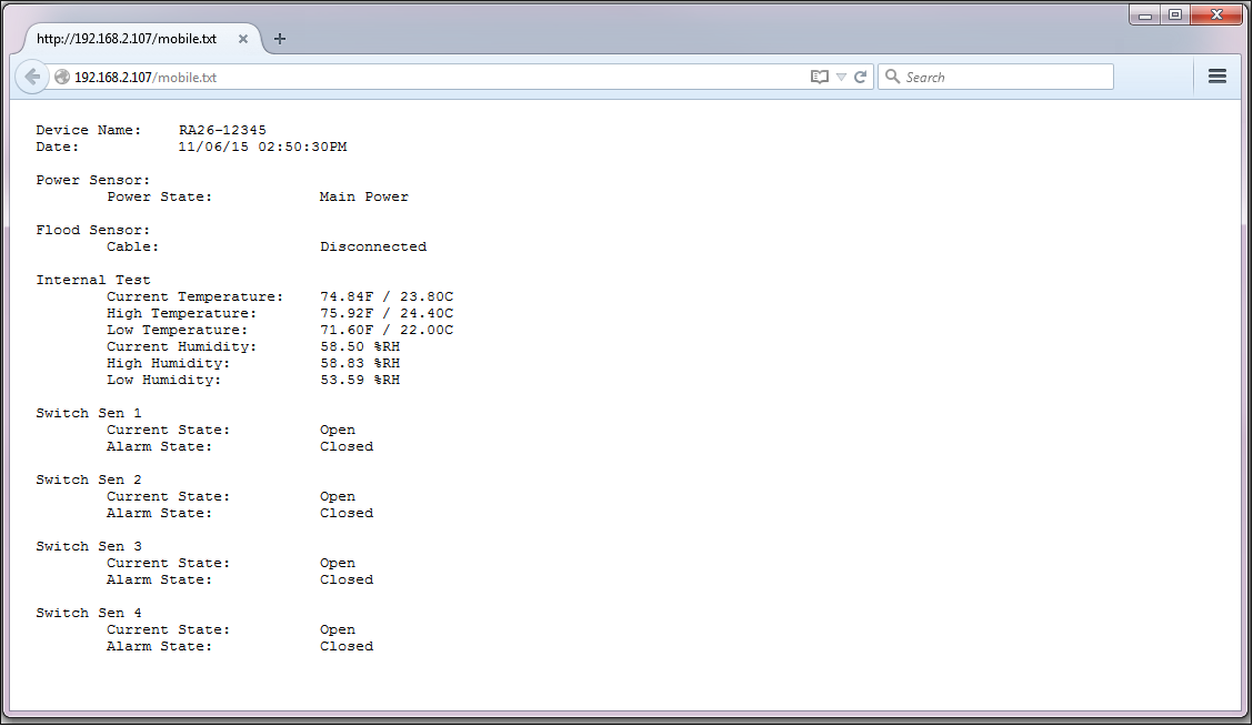 You may also test older units by entering in http://<IP Address of Device>/mobile.txt in your browser’s address bar.